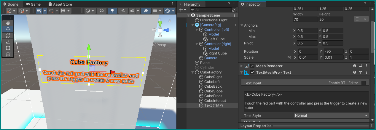 Un autre "Objet 3D" très utile que nous pouvons ajouter à l'usine est Texte - TextMeshPro. Créez-en un dans l'objet GameObject CubeFactory, et donnez-lui les paramètres suivants (il peut vous demander d'importer certaines ressources la première fois que vous le faites — laissez-le faire) :