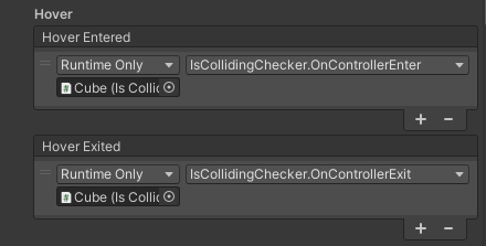 Dans ce composant, vous trouverez des évènements d'interaction, nous sommes intéressés par les évènements Hover qui correspondent à la manette touchant de près le cube (évènements déclenchés lorsque la manette touche le cube, puis quand elle en sort). Assigné le CubeInteract après avoir cliqué sur le petit symbole "+", puis dans la liste à droite choisissez le bon script et fonction à appeler.