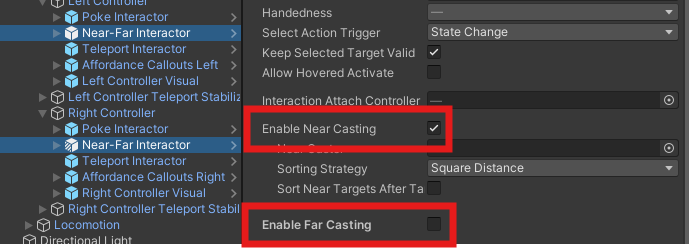 Par défaut vous pouvez créer une interaction à distance entre une manette et un objet. Si vous souhaitez n'autoriser que les interactions proche (touché) désactivez l'option "Enable Far Casting" dans les composants "Near-Far Interactor" qui sont enfants des manettes.