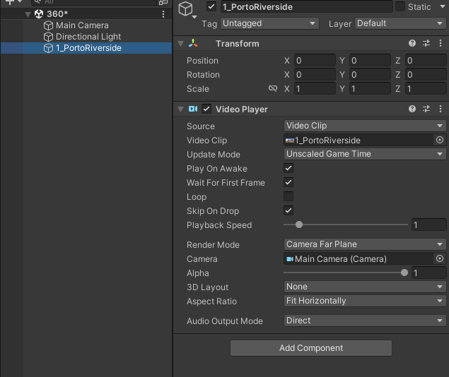 "Play on Awake" : la vidéo se lance dès que cet objet est initialisé (quand le jeu se lance possiblement). Vous pouvez aussi choisir de faire débuter la vidéo manuellement avec du code ou avec un "Unity Event" lorsque l'utilisateur interagit en VR.