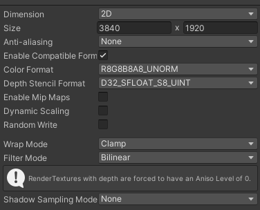 Une vidéo ne peut pas être placée comme image d'un Material, nous devons passer par un lecteur de vidéo qui va lire la vidéo et nous retourner des images. Nous allons dire à "Video Player" de placer ces images dans un objet "Render Texture". Cherchez et choisissez "Render Texture" dans "Create". Modifiez le paramètre "Size" pour qu'il ait les dimensions de votre vidéo (ici : 3840 par 1920 pixels).