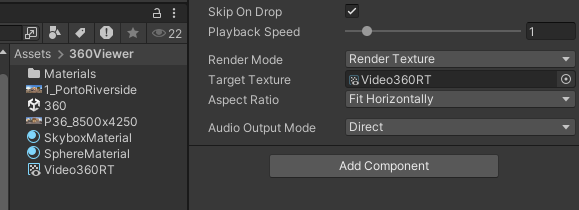 Changez l'option du composant "Video Player" comme ci-dessous pour que "Render Texture" contienne les images de la vidéos. "Render Mode" prend la valeur "Render Texture", ajoutez (glissez-déposez) ensuite la "Render Texture" que vous venez de créez dans "Target Texture".