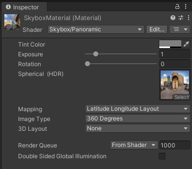 Créez un nouveau matériel nommé "SkyboxMaterial". Changez son type de shader pour "Skybox/Panoramic", puis assignez votre image 360° au paramètre "Spherical (HDR)" :
